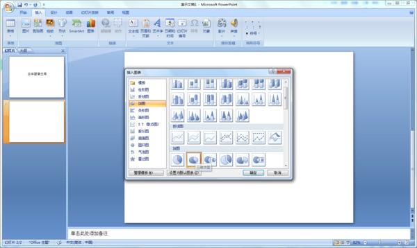 1.使用PowerPoint 2007打开一个ppt文稿,点击插入,选择图表。