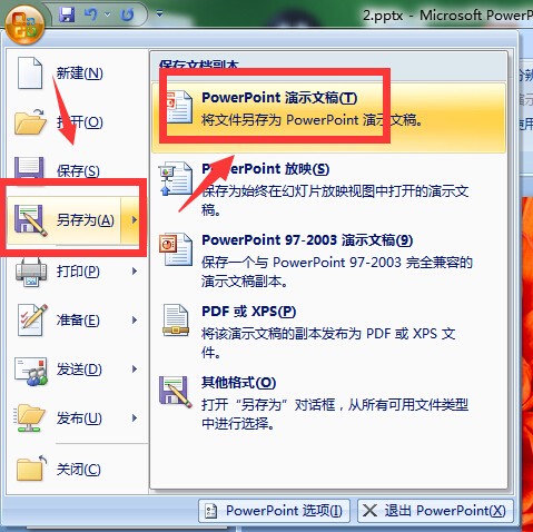 点击左上角的office图标,选择“另存为”,再选择“PowerPoint演示文稿”,保存出来的ppt就是嵌入了音乐的单个文件了,直接发给别人使用即可。