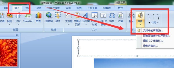 点击“插入”,再点击“声音”,选择“文件中的声音”,再选择wav格式的声音文件插入到ppt中,如果声音文件是其他格式,可以用格式工厂或者千千静听等软件将其转换成wav格式;