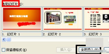 3、当要插入的幻灯片全部出现在“选定幻灯片”下的框架中时,点击“全部插入”,然后关闭选项卡。