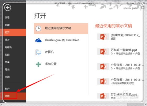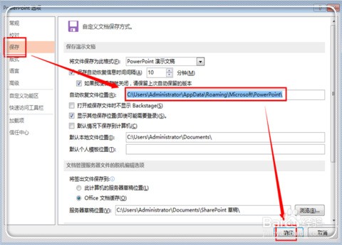 4.点击左面的菜单栏中的“保存”,并在右方“保存演示文稿”下的“自动回复文档位置”中复制恢复文档的地址“C:Users零守案学故衡声单盟范犯AdministratorAppDataRoamingMicrosoftPowerPoint”。这里是我的,以你的位置为准。复制之后点击“确定”将它关闭。