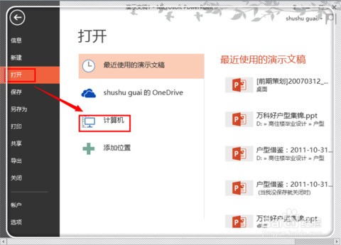 6.然后在出现的栏目中,点击“打开”。并点击“计算机”或者是“我的电脑”打开电脑相关目录。