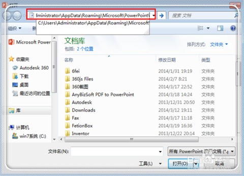 7.在打开的目录中,点击最上面的地址框后面的空白部分,把刚才复制的这个地址“C:UsersAdministratorAppDat式班药且着奏看固物aRoamingMicrosoftPowerPoint”粘贴到最上方的地址框中,然后点击“回车enter”键。