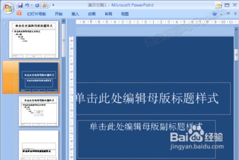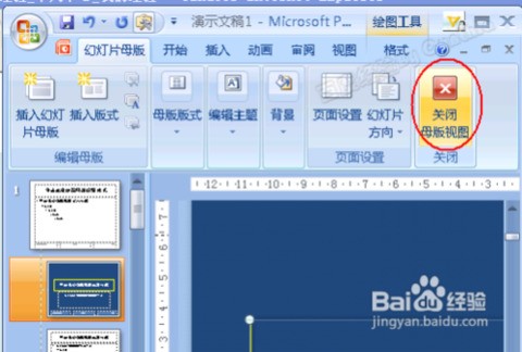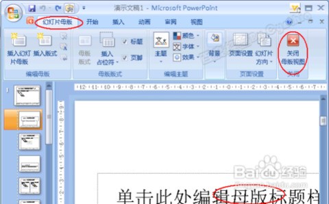 3.此时进入母版,可以看到第一个选项卡已经变成了“幻灯片母版”,同时功能区最右边的按钮也了“关闭母版视图”: