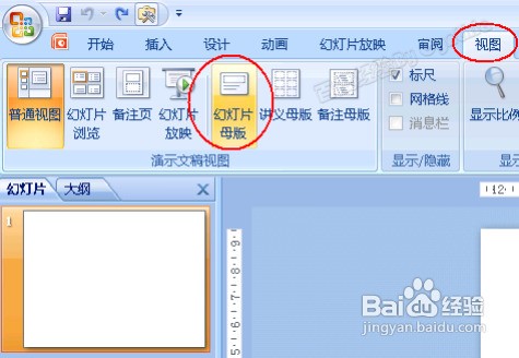 2.进入PPT后,切换到“视图”选项卡,点击其中的“幻灯片母版”按钮: