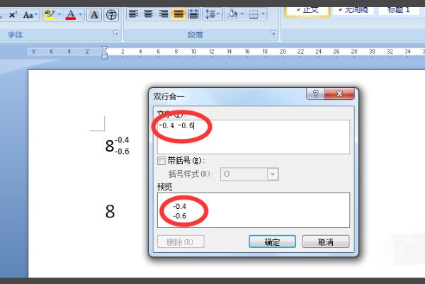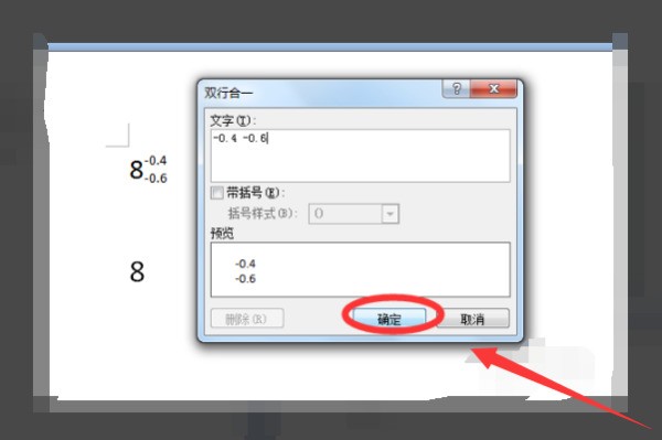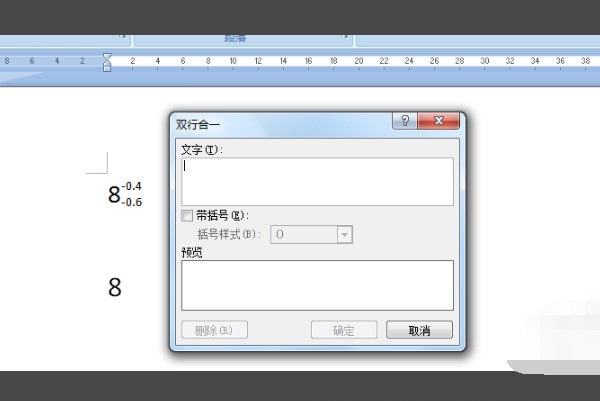 4、接下来就会出现一个双行合一的对话框,上面有一个文字编辑框,里面就可以输入上小标,下面一个预览框,输入之后可以在下面预览框;