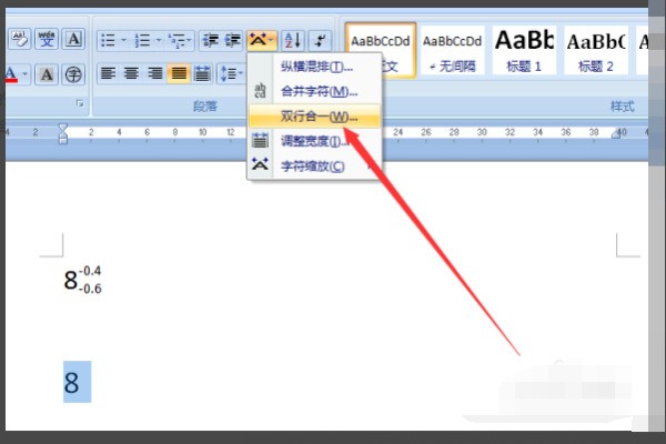 3、然后点击中文版式符号的下拉菜单,在其中可以看到一个双行合一的选项,我们点击选择双行合一选项;