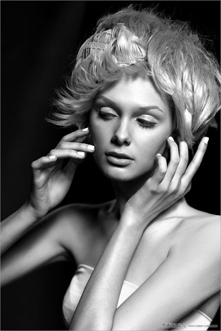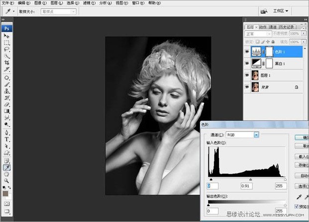 3、按住【Alt】键将【加深工具】切换为参数设置相同的【减淡工具】,按【Ctrl++】组合键放大画面的显示比例,在人像的面部以及手部涂抹,提高这些区域的曝光度,让皮肤显得白皙一些。在涂抹的时候可以随时按【[】键和【]】调整画笔的大小。