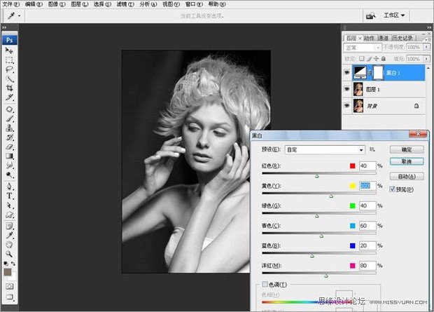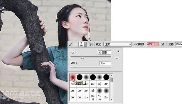 6、按【B】键选择【画笔工具】,在选项栏中选择【柔边圆】笔刷,并设置【不透明度】为60%,设置前景色为白色,选择【磨皮】图层的蒙版,用设置好的画笔在蒙版中涂去皮肤区域。注意,在涂抹时不要涂去眼球、眉毛、手镯和耳朵的轮廓,另外,要根据不同的部位随时调整画笔的大小。