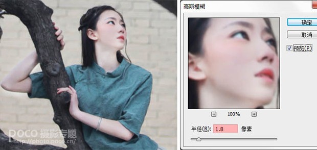 4、按【Ctrl+J】组合键将【调整明暗】图层复制一层,重命名为【磨皮】。执行【滤镜>模糊>高斯模糊】菜单命令,设置模糊的【半径】为1.8像素,得到一个比较理想的模糊效果。