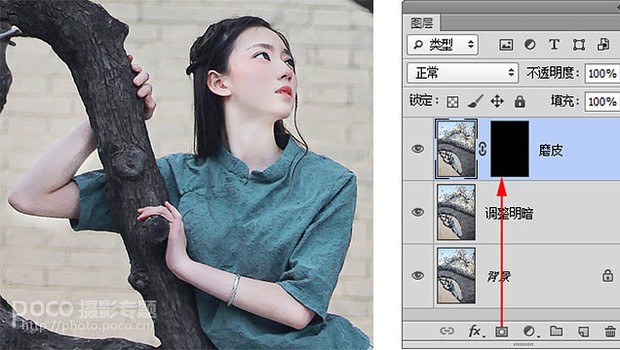 5、按住【Alt】键在【图层】面板下方单击【添加图层蒙版】按钮,为【磨皮】图层添加一个黑色的蒙版。这个黑色蒙版将完全盖住上一步做的模糊效果。
