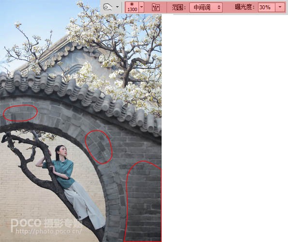 2、先来调整墙面的明暗对比。按【O】键选择工具箱中的【加深工具】,设置画笔的【大小】为1300像素、【范围】为【中间调】、【曝光度】为30%,在圈出来的的地方涂抹,加深这些区域的曝光度,让墙面呈现出比较明显的明暗对比。