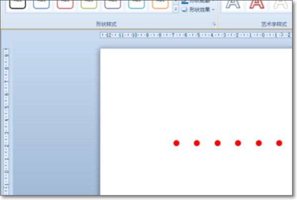 4、多等分线段。在PPT2010中插入一个小正圆缩小成一个点,按Ctrl键向右拖动复制出一个,接着连续按F4键重复上一个操作,插入多个等距离的圆点。