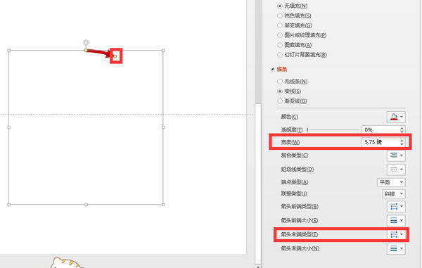 2、设置箭头:右键点击弧线,选择设置形状格式,在打开的形状格式设置面板里,线条选项下设置颜色以及线条的宽度值,并将箭头末端类型选择想要的箭头类型,然后按住弧线尾端黄色的小框进行拖动来修改箭头长度