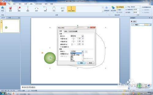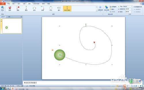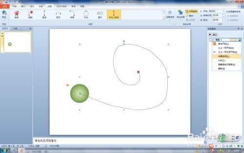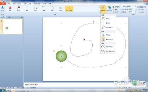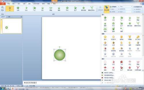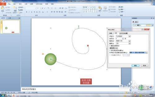 第一步:在PPT2010打开PPT文件,选择要设置动作路径--自定义路径动画对象,这里选择圆形小球形状。