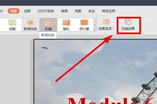1、打开PPT,找到最上面一栏的“切换”选项卡。