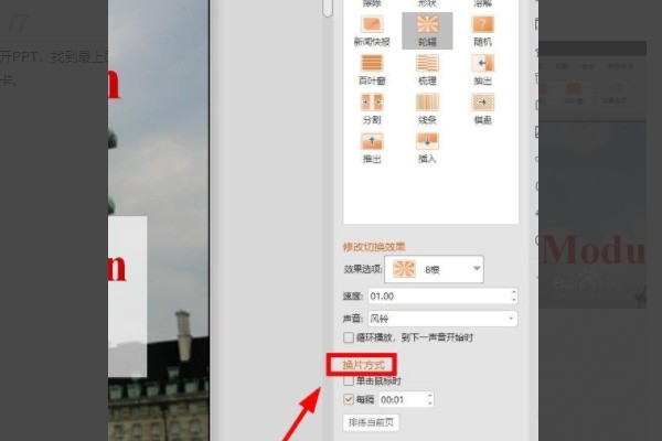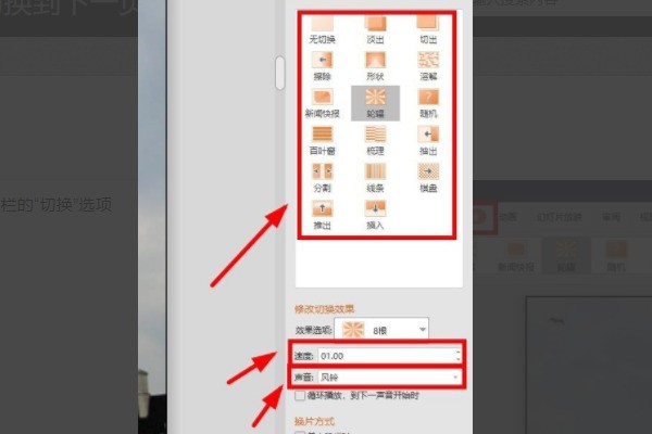 7、当然,量油略在右边这个小工具栏还可以设置幻灯片出现的样式,如“百叶窗”“轮辐”等等。