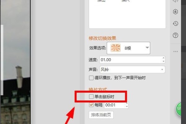 4、换片方式这一项下面有两个选项,“单击鼠标时”前面如果勾了√,都需要单击一下才能换到下一张幻灯片。我们不需要勾选。把“单击鼠标时”前面的√去掉。