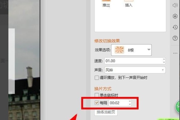 5、下面还有一项“每隔……”,这个是指上一张幻灯片切换到下一张幻灯片之间停顿的时间,如果你想让大家仔细阅读幻灯片,就把它的数值设置大一点,也就是时间长一点,这个时间力委注吗是以秒为单位的。