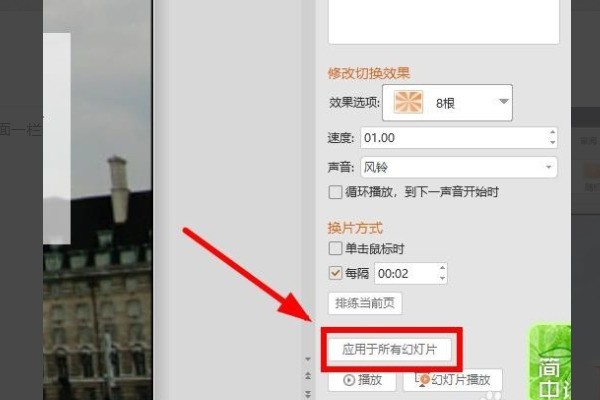 6、如果全部幻灯片都想设置为自动播放,点击最下面的“应用于全部幻灯片”,这样就设置完成了。