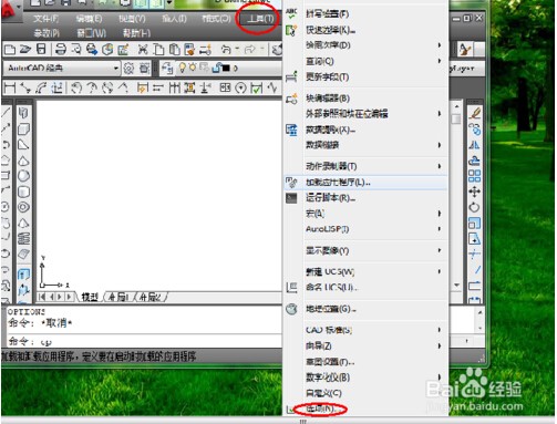 第二种办法,选择cad工具栏中的“工具”——“选项”,如第二幅图。