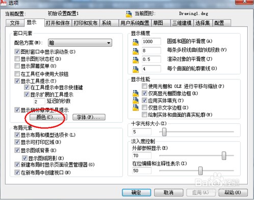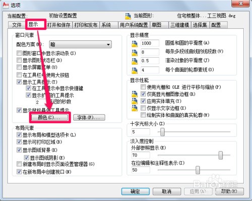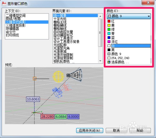 4、点击“颜色”后,会出现如下页面。由于我们一般都是使用“二维模型空间”,这里选择它,你就可以将后面的颜色调成自己喜欢的颜色了,比如黑色。