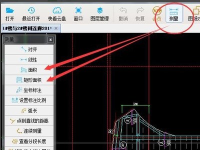 2、然后点击上方菜单栏里的“测量凳亮握”,会弹出新的菜单栏,其中测量面积的有“面积”和“矩形面积”两个枣庆选项,这里选择“面积”测量选项测量不规则形状的面积。