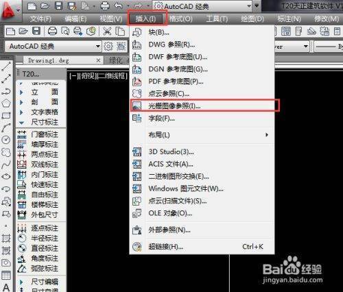 打开AutoCAD,在工具栏选择【前行插入】---【光栅参考图】