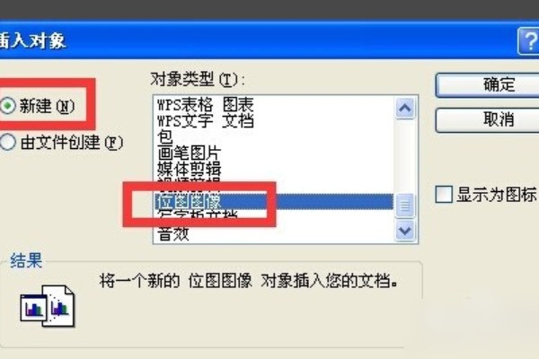 2、在“插入对象”窗口中选择“位图图像”对象类型。