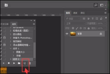 3、将动作栏调出来,点击如图位置,就可以新建一个动作。