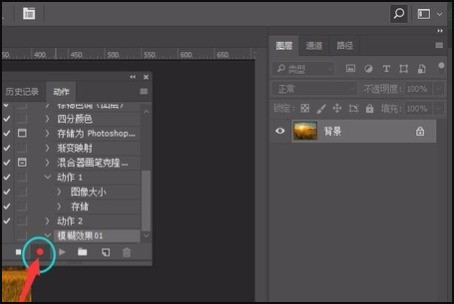 5、点击开启记录功能后,在如图位置会有一个红色标识,表示已经开启记录。这之后再PS里面操作的所有动作都会被记录下来。