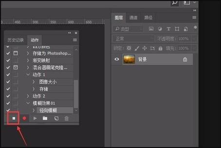 9、将图片处理完成后,点击右侧位置的关闭动作【如图】,这样一个动作就设置完成。当打开下个图片时,点击这个动作的开始按钮,就会自动呈现之前的效果。
