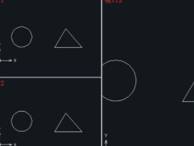 1、首先打开CAD软件,绘制一个圆形A和一个三角形B ,最上方菜单栏-视图-视口-三个视口,创建三视口。