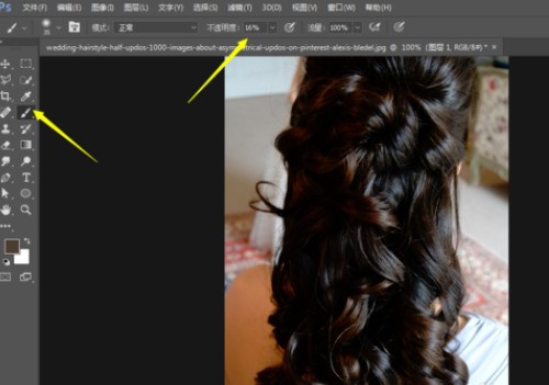 4、点击画笔工具,然后不透明度要降低触含,其实比较低很好很多,然后就可以对头发进行加光处理,只需要在头发上涂抹,注意每一块的颜色都不一样,需要重新用吸管工具再换颜色来涂抹,如下图所示。