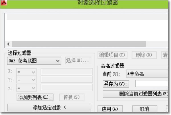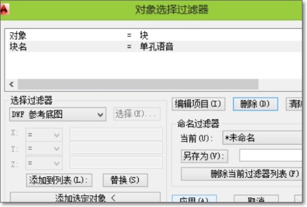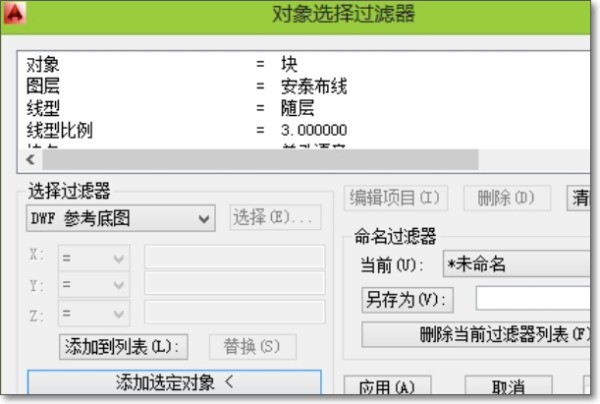 5、删除不需要统计条件(这里一般统计的是一张图纸或者图纸上一个区域的某个图块,所以只留下“块名”和“对象”两项即可,如果不是块的话可以限定图层、颜色、高度等)多用几次就明白了,