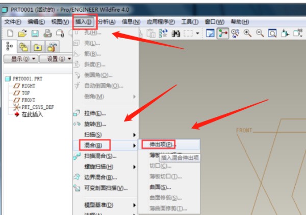 3、接着,完成上述步骤后,在顶部菜单栏中,点击插入,再点击混合,选择【伸出项】,如下图所示,然后进空保实审盾到额胡争游入下一步。