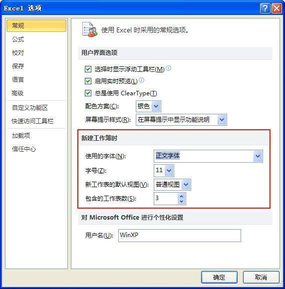 2、打开“Excel选项”,对话框后,在“常规”选项卡的“新建工作簿时”栏中进行具体的设置,如图所示: