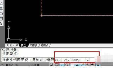 3、选择左下角的矩形顶点作为基点,再接着输入缩放比例间假0.5,即图形缩小,整体缩小一半。