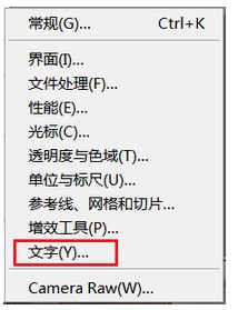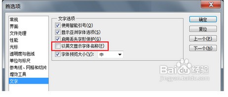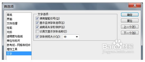 6、弹出“首选项”对话框,并定位在“文字”选项中: