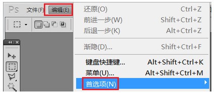 4、稍等一会打开Photoshop后,单击菜单栏中的“编辑”菜单,选择弹出菜单中的“首选项”命令: