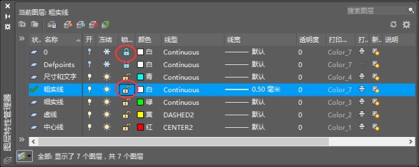 单击“图层特性”按钮,打开“图层特性管理器”对话框,如图所示,单击锁样按钮,锁定或解锁图层。