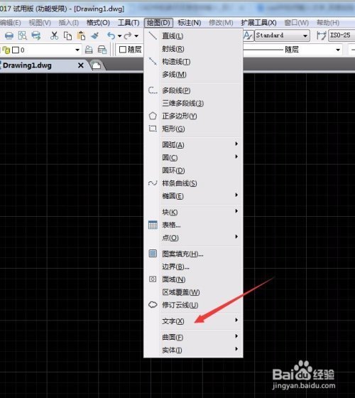 还有一种方法是新学者经常用的就是在工具栏里找,也是为了熟悉各个工具在哪里,点击绘图在下拉菜单里有文字,点击文字侧栏会出现多行文字