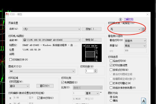 3、弹出打印对话框,将打印机--纸张--页数--居中--窗口--框选图纸选择完毕后,重点是在打印样式上的选择,默认的打印样式是“无”。