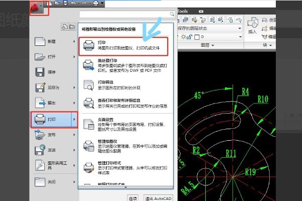 2、然后点击界面左上角A图标,再点击打印选项,选择打印命令。