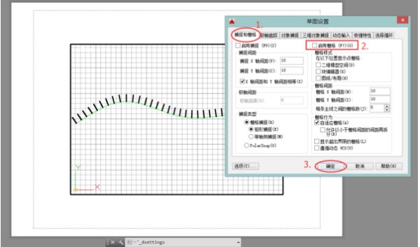 2、工具-绘图设置,打开“草图设置”对话框,如图所示,切换至“捕捉和栅格”选项卡,取消勾选“启用栅格”,单击确定按钮关闭对话框。