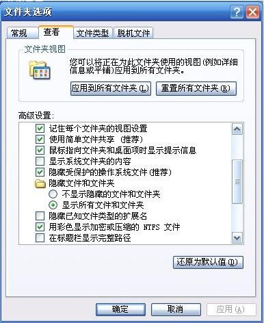 3、选中“显示所有文件和文件夹”和不选中“隐藏已知文件类型的扩展名”,就可以看到所有文件和文件夹和所有文件的扩展名(此步骤必须要做倍飞外式精任模,因为默认的自动保存路径,在WINDOWS系统里是隐藏的)。再找到C:Documents