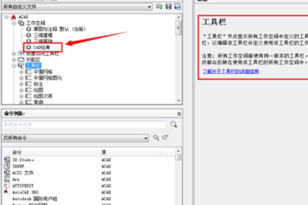 5、此时,工具栏上的信息显示在右侧。此时,单击“CAD 经典”以打开CAD经典权限的页面。