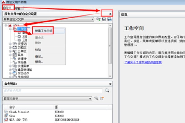 2、进入用户自定义页面,默认是输入“自定义”,假如没有找到下图中的页面,表明界面已折叠,单击箭头所示的“折叠图标”即能够打开。右键单击“工作区”,之后单击“新建工作区”。