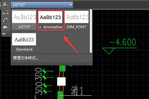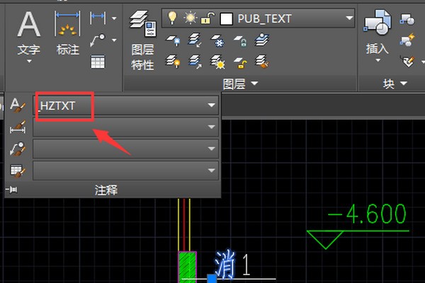 3.点击注释选项,在下拉列表中找到[HZTXT]样式的文本选项,如图: