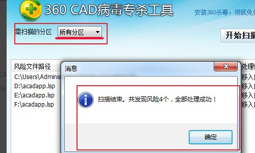 3、先关闭所有正在使用的CAD(包括天正等二次开发的CAD),使用360CAD病毒专杀工具全盘扫描。